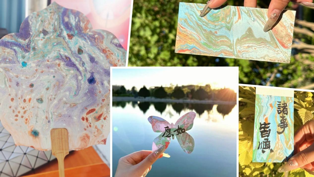 体验制作环节,是从“知”到“行”的匠心锤炼。高立武老师为大家的作品现场挥墨提字,同学们乐此不疲。参与试听的学生纷纷表示:“原来漆扇的纹路像魔法一样在水里跳舞!”,“它像是古代人的‘高科技’,我要把它带去室外再拍张美照!”。
