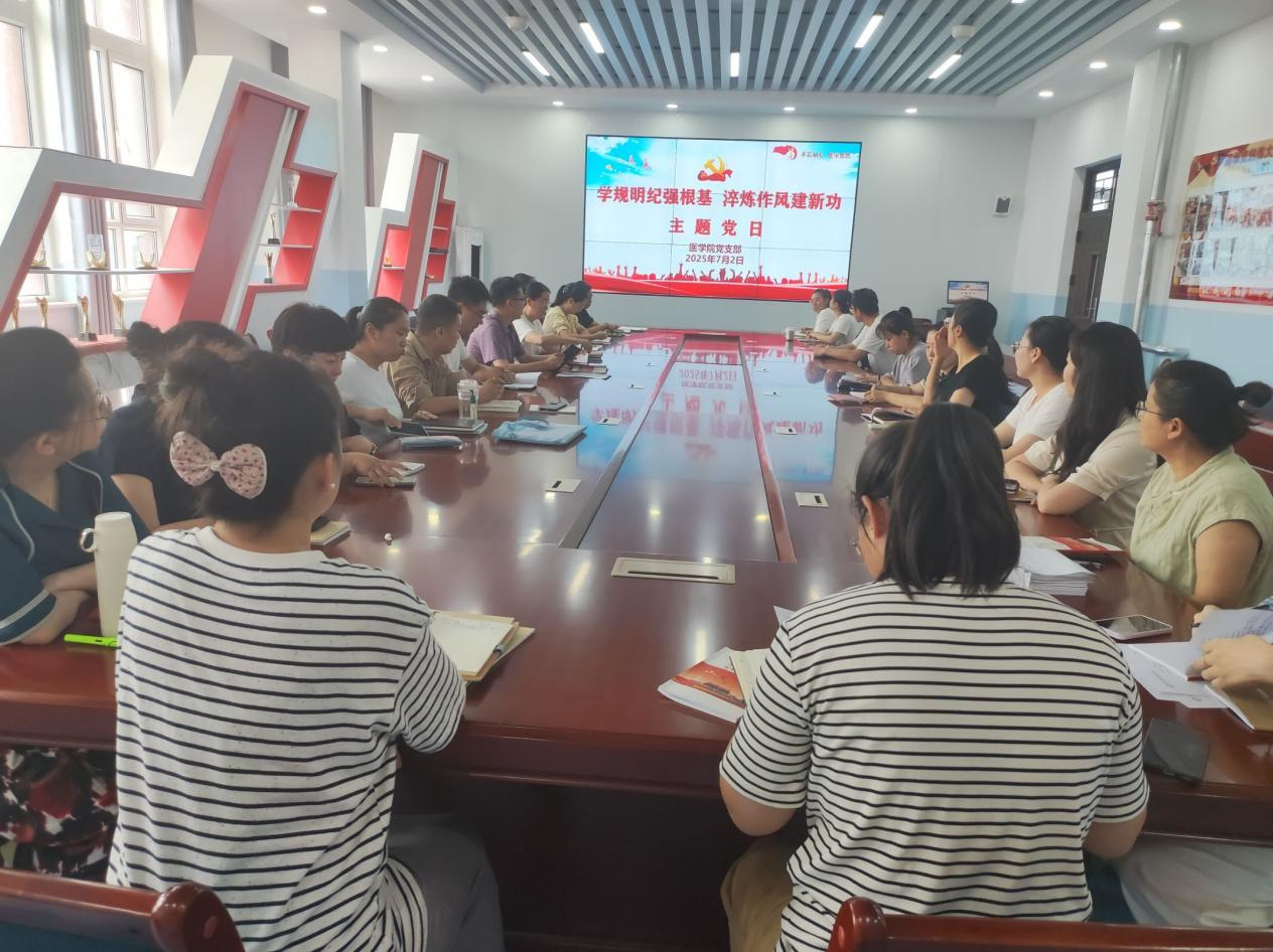 为深入学习贯彻习近平新时代中国特色社会主义思想和党的二十大精神,加强党员干部的纪律意识和作风建设,7月2日,医学院成功开展了以 “学规明纪强根基,淬炼作风建新功” 为主题的党日活动。医学院党支部书记、院长范玉敏主持活动,全体教职工参会。