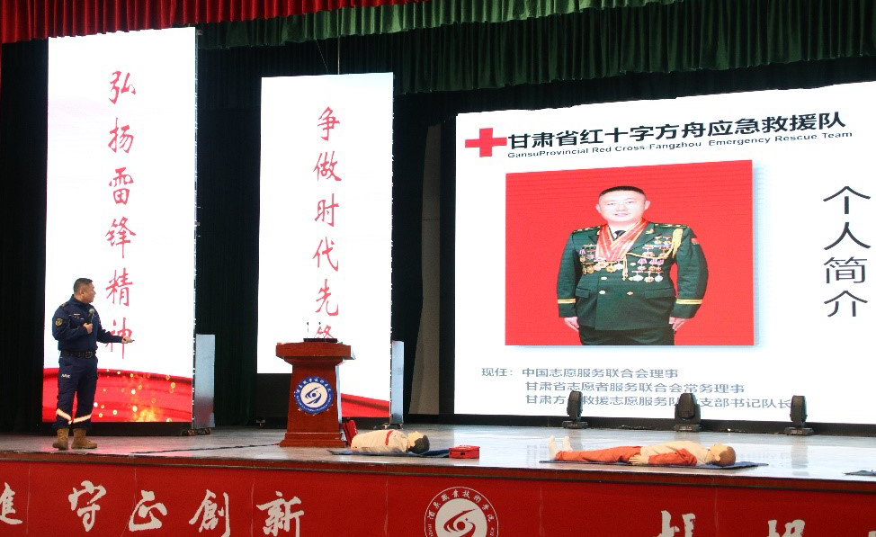 2025年3月5日,学校联合酒泉市红十字会,在胡杨文化活动中心举办“雷锋精神代代传承  融青春志愿行“3·5学雷锋”应急救护知识进校园主题活动。酒泉市红十字会专职副会长马正华,全国模范军人、甘肃省方舟救援队队长曲波,学校党委委员、副校长施荣出席活动。学校学生工作部、团委、各二级学院分管学生工作领导,师生代表共500余人参加活动。