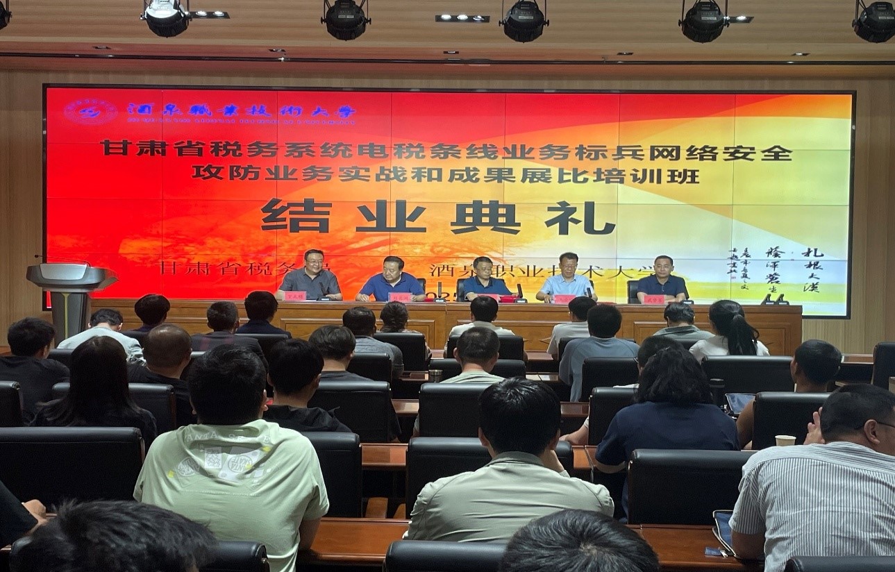 2025年5月19日下午,为期15天的甘肃省税务系统网络安全攻防业务实战和成果展培训班在酒泉职业技术大学落下帷幕。结业仪式在闻道厅举行,省市税务局相关领导、学校党委委员、副校长王金明等出席结业仪式。