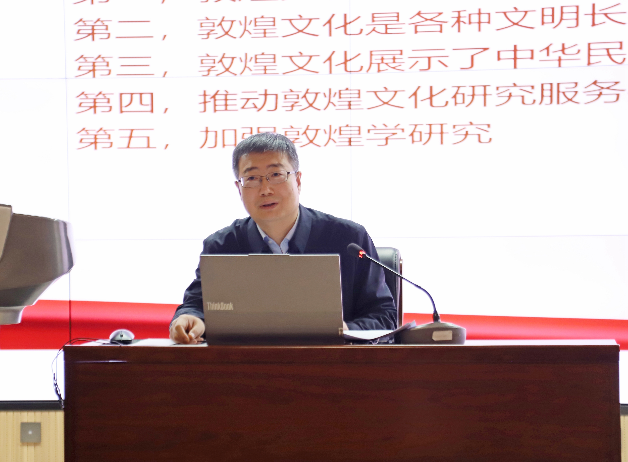程亮以《赓续莫高精神 潜心为国护宝--习近平文化思想在敦煌文化遗产保护传承中的具体实践》为题,从深入学习贯彻习近平总书记关于文化遗产保护传承的重要论述、深刻把握敦煌文化的内涵与时代价值、体悟“莫高精神”的积淀与传承、贯彻落实习近平总书记在敦煌研究院视察时的重要讲话精神、关于敦煌文化保护传承的思考等五个方面作了系统深入的阐述。报告主题鲜明、重点突出、立意高远、论述深刻,既有政治高度和理论深度,又充满实践厚度与情感温度。这既是一次精彩的宣讲,也为我校推动习近平文化思想进教材、进课堂、进头脑作出了生动示范。