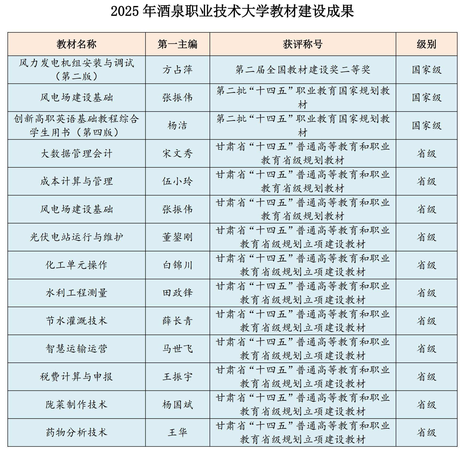 学校深化产教融合驱动教材改革,系统构建新形态教材体系。产教融合项目驱动模块化教材《风力发电机组安装与调试(第二版)》荣获第二届全国教材建设奖二等奖。《风电场建设基础》《创新高职英语基础教程综合学生用书(第四版)》2部教材入选第二批“十四五”职业教育国家规划教材,《大数据管理会计》等3部教材入选甘肃省“十四五”普通高等教育和职业教育省级规划教材。《光伏电站运行与维护》等8部新形态教材获批立项甘肃省“十四五”普通高等教育和职业教育省级规划教材建设,《数控加工技术及工艺编程》等18部校级新形态教材同步推进,形成系统化、高质量的教材建设体系。